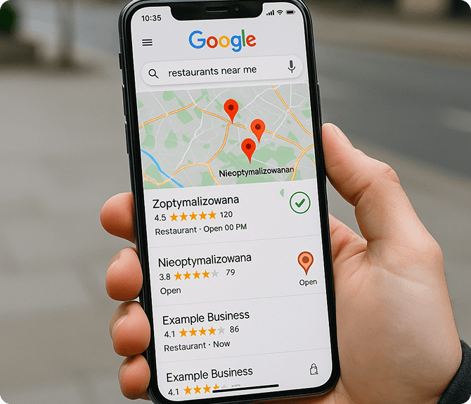 Pozycjonowanie wizytówki Google to usługa z zakresu SEO lokalnego, której celem jest zwiększenie widoczności profilu Twojej firmy w Mapach Google i lokalnych wynikach wyszukiwania. Dzięki odpowiedniej optymalizacji i regularnym działaniom wizytówka wyświetla się wyżej osobom, które faktycznie szukają Twoich usług w danej lokalizacji.